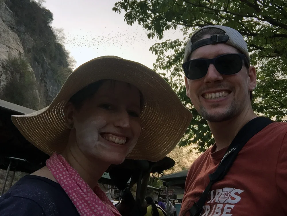 The next day we decided to visit Phnom Sampeou in the evening as it would be cooler outside and you can see a million+ bats flying out of the cave at dusk. As mentioned, it was Khmer New Year and part of the celebrations include water fights, where people stand on the side of the road with water guns, buckets, water balloons, etc. waiting to soak you as a sign of good luck. Our tuk-tuk driver had the slowest, saddest motorbike you've ever seen. It was rigged together with a water bottle and a tube that he used as coolant for the engine. (Water is not good coolant for engines, FYI.) OUR TUK-TUK WAS SOAKED! At one point Ryan was nailed by a water balloon that left a giant purple welt on his side for several days. Ryan will be very lucky this year. And I guess getting soaked did help us to stop sweating, temporarily.